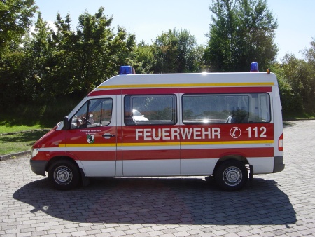 Übergabe des neuen MTW 19/1. Bereits Ende 2004 wurde ein gebrauchter Mercedes Sprinter beschafft, der in den Wintermonaten in Eigenleistung zum MTW 19/1 umgebaut wurde. Neben der Sondersignalanlage wurde ein Tisch und eine Standheizung eingebaut. Der neue MTW 19/1 erhielt keine rote Lackierung, sondern wurde großflächig mir roter Folie beklebt. Bei Finanzierung des Fahrzeugs trug die Feuerwehr einen Anteil aus der Mannschaftskasse bei, um die Gemeinde zu entlasten.